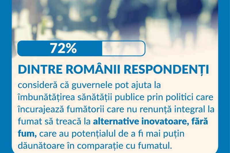 - 72% dintre românii respondenți consideră că guvernele pot ajuta la îmbunătățirea sănătății publice prin politici care încurajează fumătorii care nu renunță integral la fumat să treacă la alternative inovatoare, fără fum, care au potențialul de a fi mai puțin dăunătoare în comparație cu fumatul.