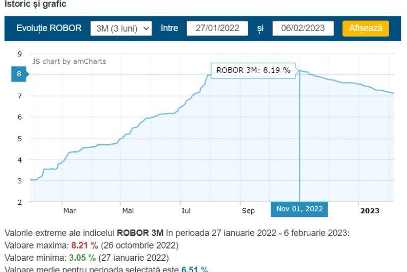 ROBOR a mai avut valoarea de 7,14% în data de 18 iulie 2022, de atunci urmând o creștere accelerată, până la peste 8%, după care s-a temperat abia spre finalul anului trecut.
