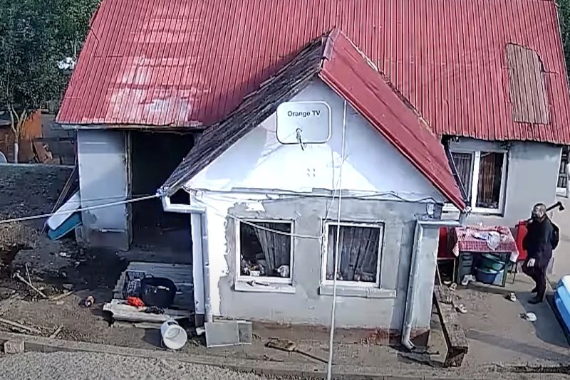 După ce îi sparge ușa și geamurile cu un topor, individul dă foc casei. Scenele șocante au fost surprinse de camera de supraveghere din curtea victimei.