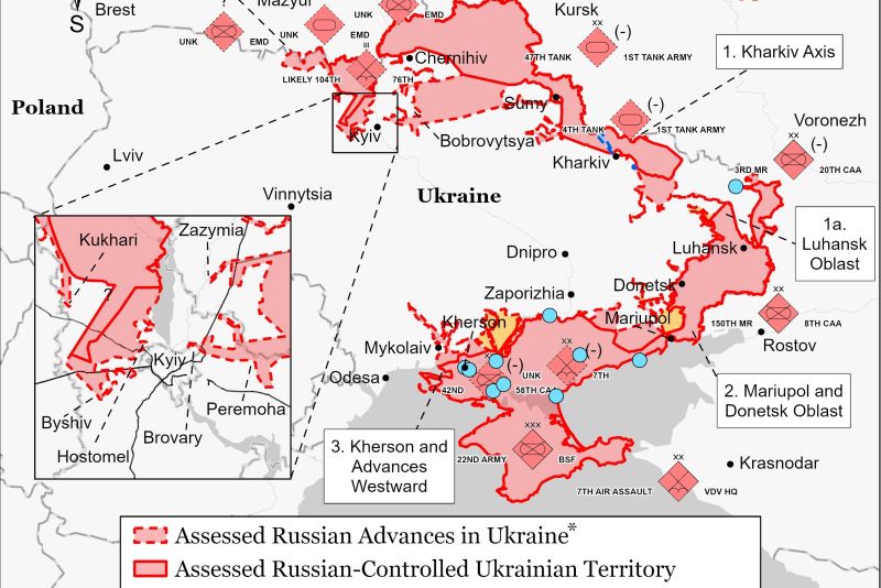 Ucrainenii controlează în continuare BROVARY, oraș din regiunea Kiev, la est de capitală. În continuare, CERNIHIV, din nordul Ucrainei, rămâne izolat, însă ucrainenii „încearcă să dezvolte linii de comunicare spre sud și cu oarecare succes”, potrivit informațiilor Departamentului Apărării.