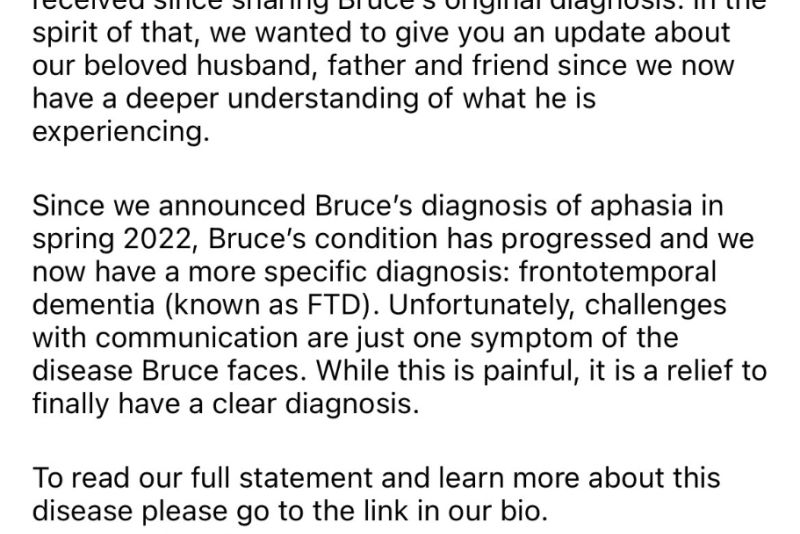 Într-o declarație pe rețelele de socializare, familia eroului din "Greu de ucis" sau "Pulp Fiction" a transmis că este o „ușurare să aibă în sfârșit un diagnostic clar”.