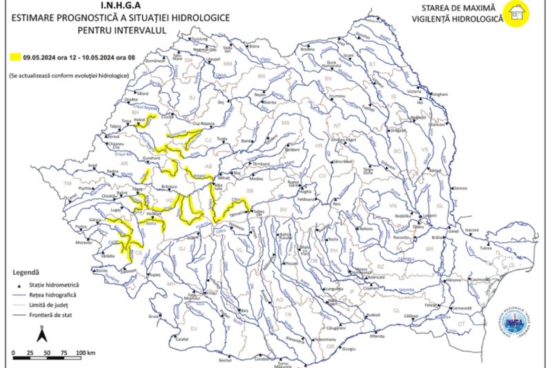 ”În cursul acestei dimineţi, specialiştii Institutului Naţional de Hidrologie şi Gospodărie a Apelor au instituit Codul galben pentru râuri din nouă judeţe ale ţării, cu valabilitate începând de astăzi, de la ora 12:00, până mâine, 10 mai, la ora 8:00”, a transmis, joi, INGHA.