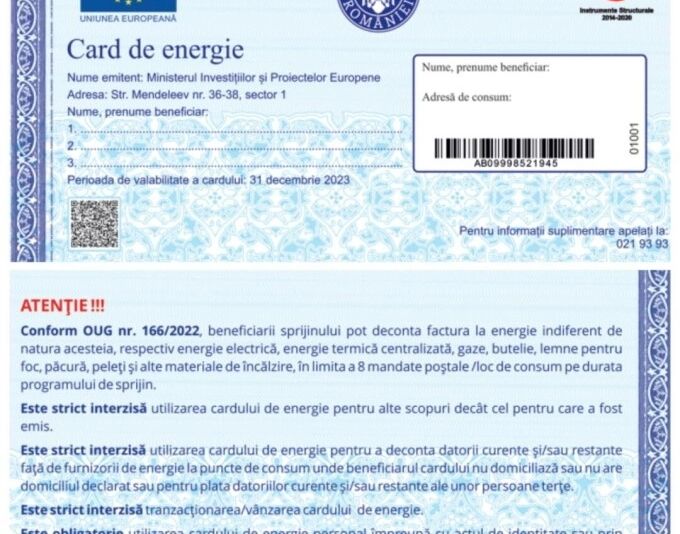 Modelul cardului de energie – în baza căruia se poate acorda ajutorul de 1.400 lei/an persoanelor vulnerabile – a fost aprobat prin ordin de ministru, vineri, 23 decembrie, transmite un comunicat al Ministerului Investiţiilor şi Proiectelor Europene (MIPE).
