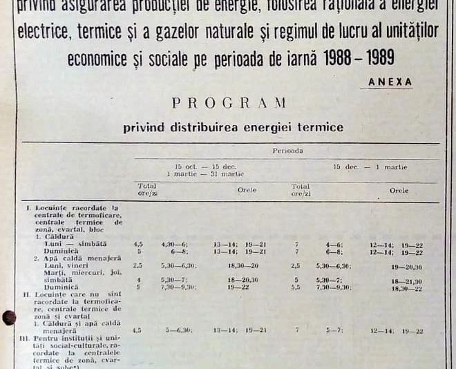 În toamna lui 1988, printr-un nou decret, autoritățile au publicat un program de furnizare a căldurii în rețeaua centralizată de termoficare, valabil la nivel național. Astfel, pe timpul sezonului rece, căldura se furniza câte 7 ore pe zi. Diferența era că în zilele lucrătoare, adică luni - sâmbătă, distribuția intervalelor cu căldură era între orele 4:00-6:00, 12:00-14:00 și 19:00-22:00, iar duminica încălzirea de dimineață de făcea mai târziu, între orele 6:00-8:00.