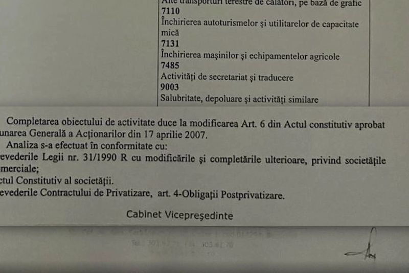 Completarea obiectului de activitate duce la modificarea articolului 6 din actul constitutiv aprobat de AGA din 17 aprilie 2007, analiza s-a efectuat în conformitate cu: (....) PREVEDERILE CONTRACTULUI DE PRIVATIZARE ARTICOUL 4, OBLIGAII POST PRIVATIZARE, se spune în document.