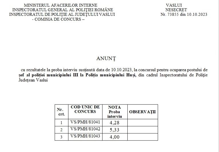 Examen pentru postul de șef la Poliția Huși. Cea mai mare notă a fost 5,33!