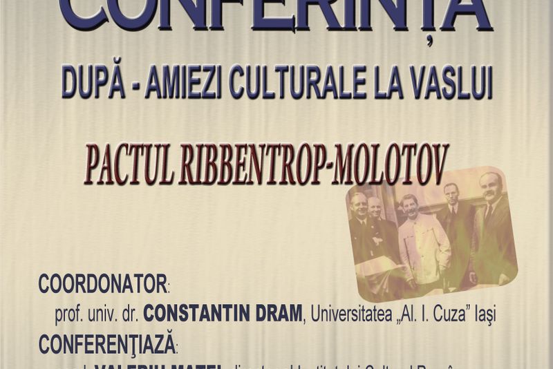 Aceasta reprezintă rodul unei frumoase colaborări dintre instituția vasluiană și prof. univ. dr. Constantin Dram, de la Universitatea „Alexandru Ioan Cuza” Iași, care, de această dată, l-a invitat să conferențieze pe academician Valeriu Matei, director al Institutului Cultural Român „Mihai Eminescu” Chișinău. Conferința are un titlu încărcat de semnificații, și anume Pactul „Ribbentrop-Molotov”.„Uneori, capitole ale istoriei zac în sertarele închise ale memoriei. Noi, cei care astăzi ființăm și care, la rândul nostru, vom deveni amintire, nu avem dreptul să uităm ceea ce a marcat mersul istoric al lumii în care trăim. Tema pe care v-o propunem în această lună atinge un subiect sensibil și controversat, având în centrul ei adevărul. Vă așteptăm la Biblioteca Județeană pentru o întâlnire în care istoria va vorbi prin intermediul unui invitat de marcă, domnul academician Valeriu Matei”, a declarat Voicu Gelu Bichineț, directorul Bibliotecii Județene „Nicolae Milescu Spătarul”.