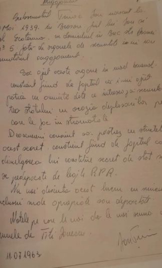 Deasemeni consimt să păstrez cu strictețe acest secret, conștient fiind de faptul că divulgarea lui constituie secret de stat și se pedepsește de legile RPR.