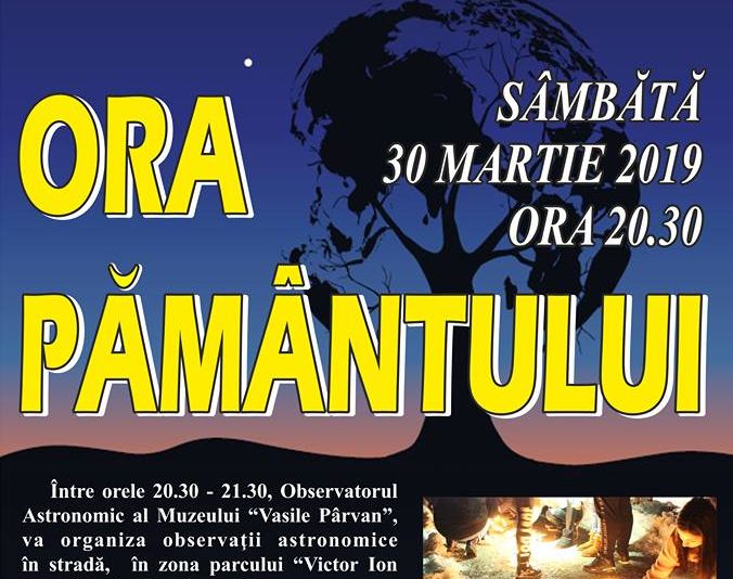 Ora Pământului 2019 este un moment-cheie pentru oameni, companii, autorități să își folosească puterea pentru a face schimbări la nivel personal, dar și la nivel global, încât să protejeze natura de care depinde bunăstarea și dezvoltarea umanității.Earth Hour a început în 2007, când peste 2.2 milioane de oameni și 2000 de sedii de companii din Sydney - Australia au stins luminile pentru o oră, din nevoia de a atrage atenția, la nivel global, asupra problemei schimbărilor climatice. De atunci, oameni din peste 7.000 de orașe din mai mult de 180 de țări s-au alăturat acestei mișcări de mediu.Ora Pământului se sărbătoreşte în România din anul 2009, iar din anul 2013 şi oraşul Bârlad se alătură acestei manifestări, prin iniţiativa echipei de la observatorul astronomic al Muzeului „Vasile Pârvan”. Cu prilejul evenimentului global „Ora Pământului” instituţia noastră va organiza observaţii astronomice în stradă. Primăria Municipiului Bârlad ne va susţine în această activitate, şi va solicita oprirea iluminatului public în data de 30 martie 2019, intervalul orar 20.30 - 21.30.Observaţiile astronomice din stradă vor avea loc sâmbătă 30 martie 2019, între orele 20.30 şi 21.30, în zona parcului „Victor Ion Popa” (la strada principală).În cazul în care condiţiile meteo nu vor fi favorabile, activitatea se va desfășura la sediul observatorului astronomic (str. Republicii nr. 235), cu o prezentare despre impactul activităţilor umane asupra mediului înconjurător.