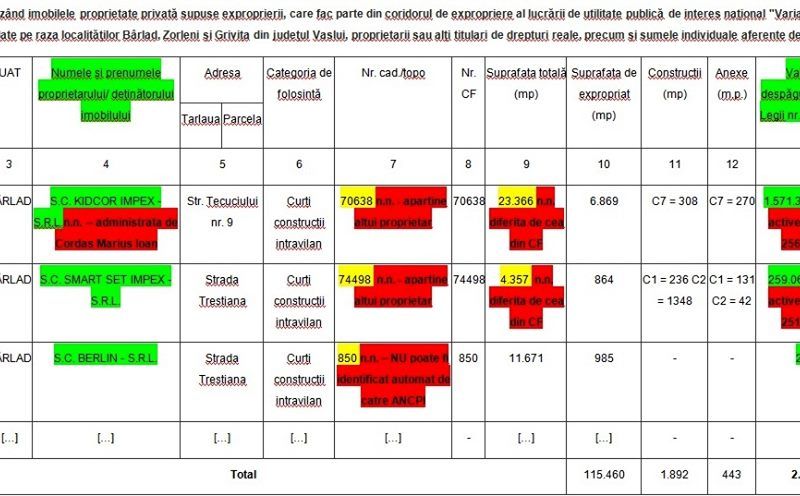 Studiind anexa nr.2, observăm că, dintr-un total de 108 imobile, situate pe raza UAT-urilor Bârlad, Grivița și Zorleni, pentru exproprierea cărora s-a alocat suma totala de 2.279.223 lei, cea mai mare parte a sumei în cauză (2.051.920 lei) este alocată singurelor trei imobile din municipiul Bârlad, de pe listă, iar dintre acestea trei, cei mai mulți bani (1.571.335 lei) sunt primiți de către S.C. KIDCOR IMPEX - S.R.L., societate care a încheiat anul 2018 cu total active raportate la A.N.A.F. in valoare de doar 256.784,00 lei (de unde întrebarea firească – pentru ce bun/drept patrimonial poate primi mai bine de 1,5 milioane de lei o societate care are în patrimoniu bunuri care valorează puțin peste 0,25 milioane de lei – ADICĂ DE ȘASE ORI MAI PUȚIN), și care e administrată de omul de afaceri Cordaș Marius Ioan, de al cărui nume a fost legat, de-a lungul timpului, de acuzații de cămătărie, fraude informatice și legături dubioase cu șefi din I.P.J. Vaslui.Dar să zicem că asta nu-i foarte grăitor, câtă vreme nu ești economist/contabil de profesie. Problema e că, verificând coordonatele cadastrale (Nr. cad/topo, respectiv Nr. CF), indicate in anexa 2, pentru primele trei imobile (din Bârlad - verificare pe care o poate face oricine, online - dacă își face un cont pe portalul ANCPI, contra unei taxe de 20 lei/CF, ori direct la sediul BCPI Bârlad, completând o cerere si plătind o taxa de 25 lei/CF), se constată ca imobilele de la punctele 1 si 2 din tabel, cărora le aparțin respectivele coordonate cadastrale, au cu totul alte suprafețe și se află în proprietatea altor persoane decât cele indicate în anexa nr.2., extinzând verificarea respectivelor coordonate cadastrale și pentru celelalte doua UAT-uri (Grivița si Zorleni), constatându-se aceleași deficiențe, iar în cazul imobilului de la punctul 3 din tabel, acesta neputând fi identificat automat de către ANCPI, pe baza Nr. cad. si de C.F. indicat, în niciuna dintre cele trei UAT-uri vizate de expropriere.Conform Art.3 alin. (1) sumele individuale estimate de expropriator, aferente despăgubirilor pentru imobilele proprietate privată care constituie coridorul de expropriere al lucrării de utilitate publică de interes național „Varianta de ocolire Bârlad", situate pe amplasamentul prevăzut la art. 1, aflate pe raza localităților Bârlad, Zorleni și Grivița din județul Vaslui, sunt în cuantum total de 2.279,3 mii lei și sunt alocate de la bugetul de stat, prin bugetul Ministerului Transporturilor, în conformitate cu Legea bugetului de stat pe anul 2019 nr. 50/2019, cu modificările și completările ulterioare, la capitolul 84.01 "Transporturi", subcapitolul 03 "Transport rutier", titlul 58 "Proiecte cu finanțare din fonduri externe nerambursabile aferente cadrului financiar 2014-2020", articolul 58.01 "Programe din Fondul European de Dezvoltare Regională" – FEDR.Iar potrivit Art.4, din aceeași H.G., Ministerul Transporturilor, prin Compania Națională de administrare a Infrastructurii Rutiere - S.A., răspunde de realitatea datelor înscrise în lista cuprinzând imobilele proprietate privată care constituie coridorul de expropriere al lucrării de utilitate publică de interes național, situat pe amplasamentul prevăzut la art. 1, de corectitudinea datelor înscrise în documentele care au stat la baza stabilirii acestora, precum și de modul de utilizare, în conformitate cu dispozițiile legale, a sumei alocate potrivit prevederilor prezentei hotărâri.