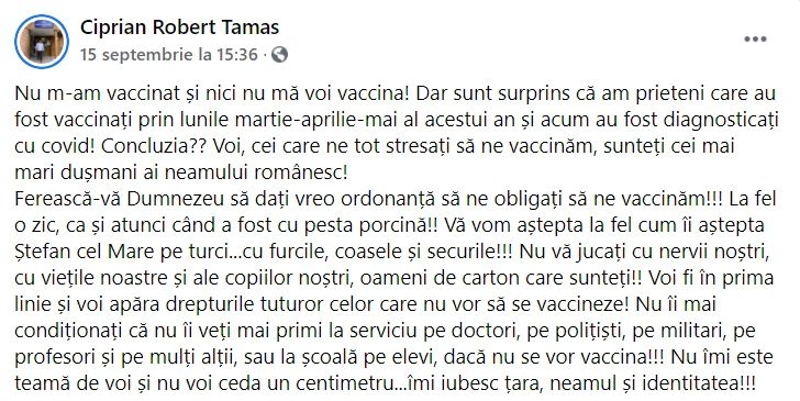 "Nu sunt împotriva vaccinării pentru persoanele care doresc asta. Soția mea, mama mea și soacra mea s-a vaccinat. Este un drept al nostru. Cum noi îi respectăm pe cei care s-au vaccinat, așa și noi să fim respectați. Nimeni nu ne poate contrazice că nu avem dreptate noi, cum, de altfel, nici noi nu îi putem contrazice pe cei care spun că dacă nu ne vom vaccina vom ajunge la spital sau, eu știu, virusul ne va face mai mult rău nou, celor ne vaccinați.