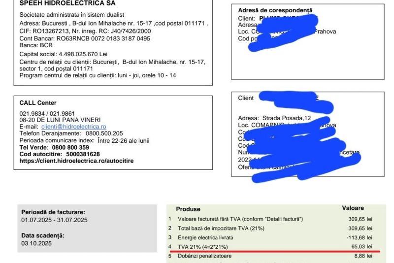 Într-un grup Facebook al abonaților companiei de stat Hidroelectrica au apărut numeroase facturi pentru consumul din luna iulie, cu sume majorate atât din cauza scumpirii intersectoriale, cât și prin aplicarea cotei de TVA de 21%.