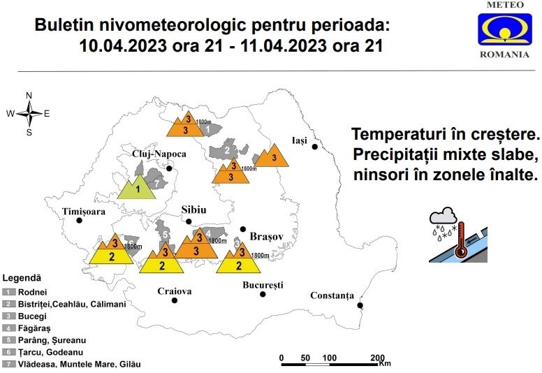 La altitudini mai mici de 1800 m se vor semnala temporar precipitații mixte, ploi ziua, când temperaturile vor fi pozitive. Acestea vor duce la umezirea stratului de zăpadă recent, local consistent, format din zăpadă grea și depus peste stratul vechi sau peste sol. În special între 1600 și 1800 m, unde zăpada are dimensiuni mai importante, se pot declanșa avalanșe de dimensiuni mici și izolat medii, riscul declanșării acestora fiind amplificat la supraîncărcări.
