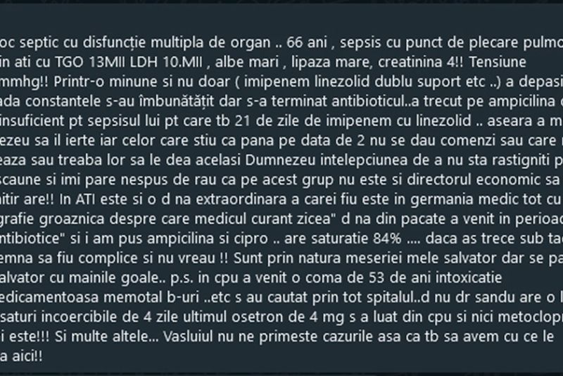 „C. s. șoc septic cu disfuncție multiplă de organ, 66 ani, sepsis cu punct de plecare pulmonar, ajuns în ATI cu TGO 13MII LDH 10.MII, albe mari, lipaza mare, creatinina 4!! Tensiune 74/35mmhg!! Printr-o minune și nu doar (imipenem linezolid dublu suport, etc) a depășit perioada. Constanțele s-au îmbunătățit, dar s-a terminat… antibioticul! A trecut pe ampicilină cipro mnz.. Insuficient pentru sepsisul lui, pentru care trebuia 21 de zile de imipenem cu linezolid.. Aseară a murit! Dumnezeu să îl ierte, iar celor care știu că până pe data de 2 (2 mai, n.r.) nu se dau comenzi sau care nu semnează sau treaba lor să le dea același Dumnezeu înțelepciunea de a nu sta răstigniți pe niște scaune și îmi pare nespus de rău că pe acest grup nu este și directorul economic, să vadă ce cimitir are!!”, le-a scris colegilor pe grupul rezervat medicilor, unul dintre medicii care nu au mai vrut să se facă părtași la moartea unor pacienți.