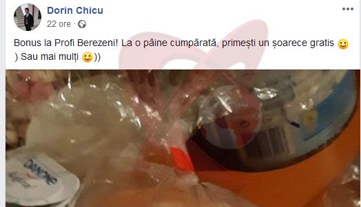 „Bonus la Profi Berezeni! La o pâine cumpărată, primeşti un şoarece gratis. Sau mai mulţi”, a scris Dorin Chicu în descrierea fotografiei postate pe internet.