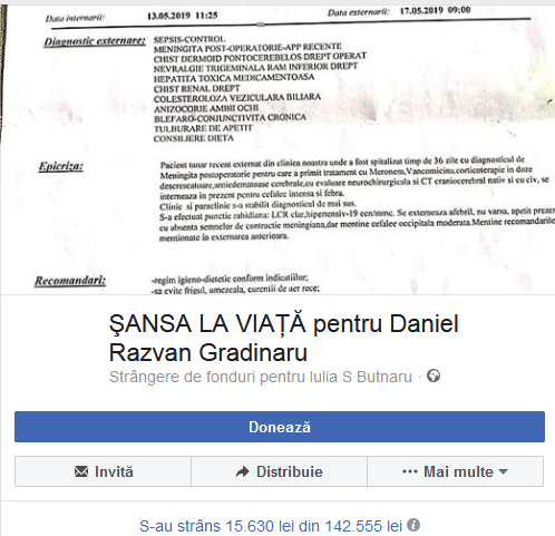 „Buna, ma numesc Gradinaru Daniel Razvan ,sat. Popeni ,am 23 de ani, sunt student in anul IV la Universitatea de Stiinte Agricole si Medicina Veterinara din Iasi, specializarea TPPA. De cateva luni ma lupt sa ma fac bine si sa imi continui visele . Dupa ziua mea in februarie au inceput cele mai urate luni din viata mea si a parintilor mei, fiind singurul copil al familiei. Am fost diagnosticat cu chist dermoid pontocerebelos drept pentru care am fost operat de doua ori in Romania. Fiecare operatie a fost urmata de complicatii care m-au tinut aproximativ sase luni in spital: meningita, hepatita toxica medicamentoasa, nevragie, chist renal drept si altele. Dupa toate eforturile depuse de medici acesta continua sa reapara tulburandu-mi linistea dar, mai ales sanatatea. Ultimul RMN a confirmat faptul ca acesta a mai crescut si am nevoie de o noua interventie chirurgicala, insa de aceasta data am nevoie de ajutorul vostru pentru a putea face fata cheltuielilor, mai exact 30.000 euro pentru a putea ajunge la Spitalul Universitar AKH din Viena, Austria. Pentru a ma putea ajuta puteti face donatii in urmatoarele conturi:Titular Gradinaru Nela (mama)Banca BRD Groupe Societe Generale IN RON - SWIFT: BRDEROBU - IBAN: RO89BRDE380SV46002763800 IN EURO -SWIFT: BRDEROBU -IBAN: RO03BRDE380SV50872913800