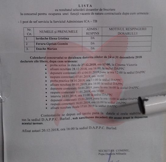 Postul a fost scos la concurs de către Direcția Administrării Piețelor, Parcărilor și Cimitirelor (DAPPC) în luna decembrie a anului trecut, iar după selecția dosarelor au fost acceptate trei persoane: Iordache Elena Cristina, Feraru Ciprian Cosmin și Enache Marian.Conform anunțului publicat la avizier, proba scrisă ar fi trebuit să se desfășoare pe data de 27 decembrie 2018, în sediul Cinematografului Victoria, însă din anumite motive locația a fost schimbată și anume în sediul DAPPC Bârlad (în Piața Centrală).Cei trei concurenți au fost anunțați telefonic, cu o oră înainte, despre schimbarea survenită însă la susținerea probei scrise programate la ora 11:00 s-a prezentat doar un singur candidat, și anume Enache Marian.Ciprian Feraru a depus o contestație cu privire la desfășurarea probei scrise, în aceste condiții concursul fiind suspendat până la soluționarea acesteia.„În acest moment, concursul este suspendat, deoarece s-a depus o contestație de către unul dintre candidați. Soluționarea va veni în termen de 15 zile, după ce o comisie va analiza contestația depusă de candidatul respectiv”, ne-au precizat reprezentanții DAPPC Bârlad.Ciprian Feraru este în prezent consilier județean din partea Partidului Social Democrat. El a debutat în politica locală bârlădeană în rândurile Partidului Național Liberal, iar în 2014 a trecut în tabăra social-democrată, dându-și demisia din funcția de președinte al organizației liberale.
