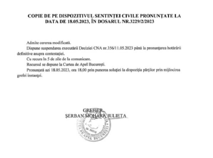 Victorie pentru postul nostru de televiziune Realitatea PLUS! Instanța a decis, astăzi, suspendarea deciziei CNA de a opri emisia timp de 10 minute, în intervalul 19:00-19:10