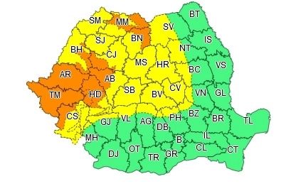 Local în Banat, Crișana, vestul Transilvaniei și nordul Carpaților Orientali vor fi perioade cu averse torențiale, vijelii puternice, frecvente descărcări electrice și pe arii restrânse grindină. În intervale scurte de timp sau prin acumulare se vor înregistra cantități de apă de peste 40...60 l/mp și izolat 70 l/mp.