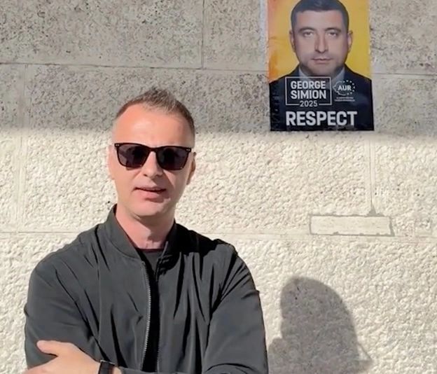 "După cum vedeți, afișul lui George Simion, lipit pe zidul unei gări din Italia, mai precis undeva în Ostia, undeva aproape de Roma. În același timp, știm cu toții cum mașinile cu leduri ale lui Nicușor Dan bântuie prin marile capitale ale Europei. Ce-i mai simplu, ce-i mai curat, acest afiș pus de un român anonim din diaspora, sau mașinile care cheltuie banii de la bugetul statului român ale lui Nicușor Dan? Gândiți-vă înainte la asta, fraților, înainte să votați", spune bărbatul.