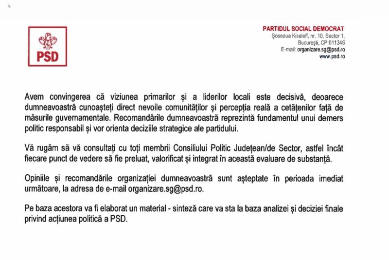 Scrisoarea subliniază necesitatea unei analize realiste, pornind de la rezultatele alegerilor locale parțiale, unde PSD a câștigat 12 din 14 unități administrativ-teritoriale, dar a pierdut Bucureștiul.