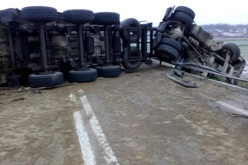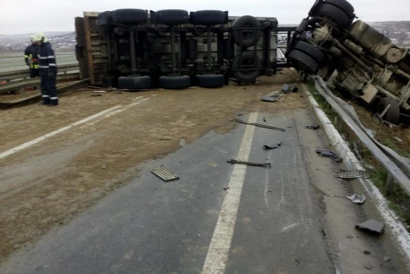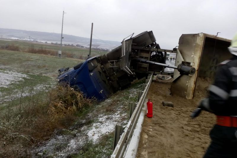Un camion plin cu nisip s-a răsturnat pe DE 581, blocând circulația