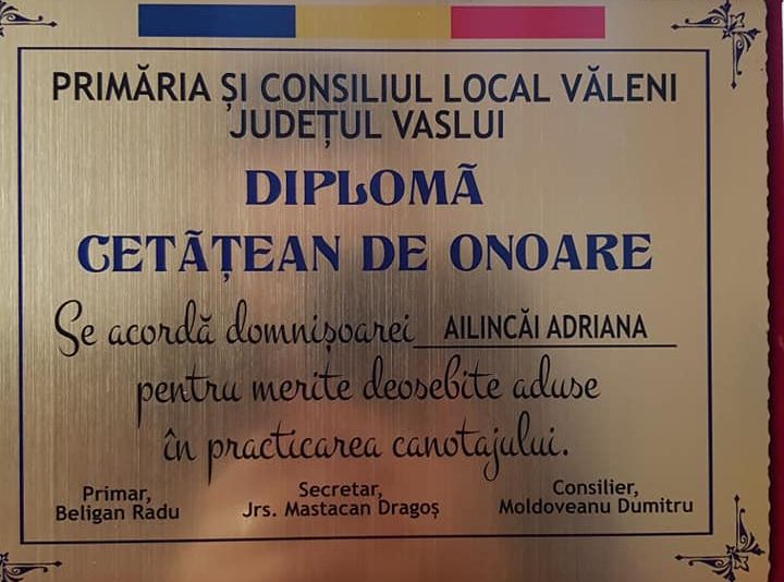 Inițiativa a aparținut primarului Radu Beligan, iar consilierii au fost de acord cu proiectul.Astfel, în prezența campioanei europene la canotaj, a fost decernat titlul de ”Cetățean de onoare”.”Nu am crezut că voi ajunge vreodată cetățean de onoare al acestei comune. Mulțumesc enorm comunei pentru că m-a susținut și pentru tot ce a făcut pentru mine. Anul viitor este anul calificărilor la Olimpiadă și sperăm să ne calificăm acolo și în 2020 să obținem o medalie cât mai strălucitoare”, a declarat Adriana Alinicăi.Primarul Radu Beligan susține că sportiva este un exemplu pentru comuna Văleni: ”Oameni ca Adriana Ailincăi ne reprezintă și sperăm ca, de acum înainte, să se vorbească de comuna nostră prin prisma unor astfel de oameni”. Adriana Ailincăi a plecat din Văleni din clasa a VI-a, fiind legitimată în prezent la CSM Călărași.Este multiplă campioană națională, dublă campioană balcanică, vicecampioană europeană în 2016, ocupantă a locului 7 la Campionatul Mondial de la Rotterdam (Olanda) și medaliată cu aur la Campionatele Europene de la Krefeld, Germania, din 2017, medaliată cu aur și titlul de campioană europeană în 2018 si locul 5 la Campionatul Mondial din Bulgaria.